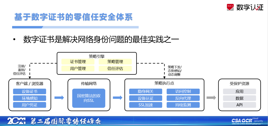 2021年6月25日,由联合国数字安全联盟指导,云安全联盟大中华区(简称“CSA GCR”)和青岛市工业和信息化局联合主办的第二届国际零信任峰会在青岛盛大召开。本届峰会以“数字时代:零信任剑行天下”为主题,北京美高梅官网正网股份有限公司(以下简称“美高梅官网正网”)因在零信任领域技术创新的卓越表现也受邀出席,由公司资深密码技术专家夏冰冰博士在现场发表了“密码技术在零信任安全中的作用与实践”主题演讲,赢得峰会众多与会嘉宾的充分认可。