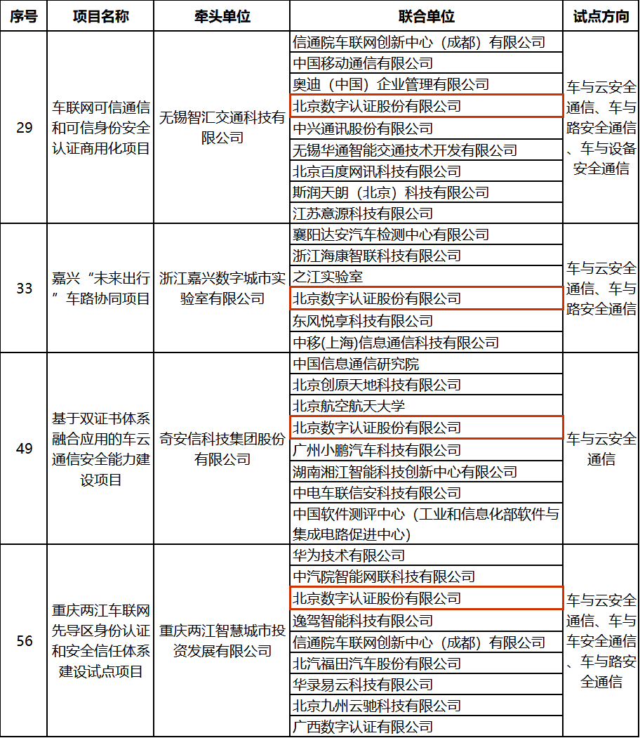 近日,工业和信息化部正式公布了车联网身份认证和安全信任试点项目名单。北京美高梅官网正网股份有限公司(简称“美高梅官网正网”)作为国内领先的网络信任与数字安全服务提供商,共参与4个试点项目组队申报并成功入围。这4个试点项目分别在无锡、重庆两江、长沙和嘉兴四个国家级车联网先导区开展。