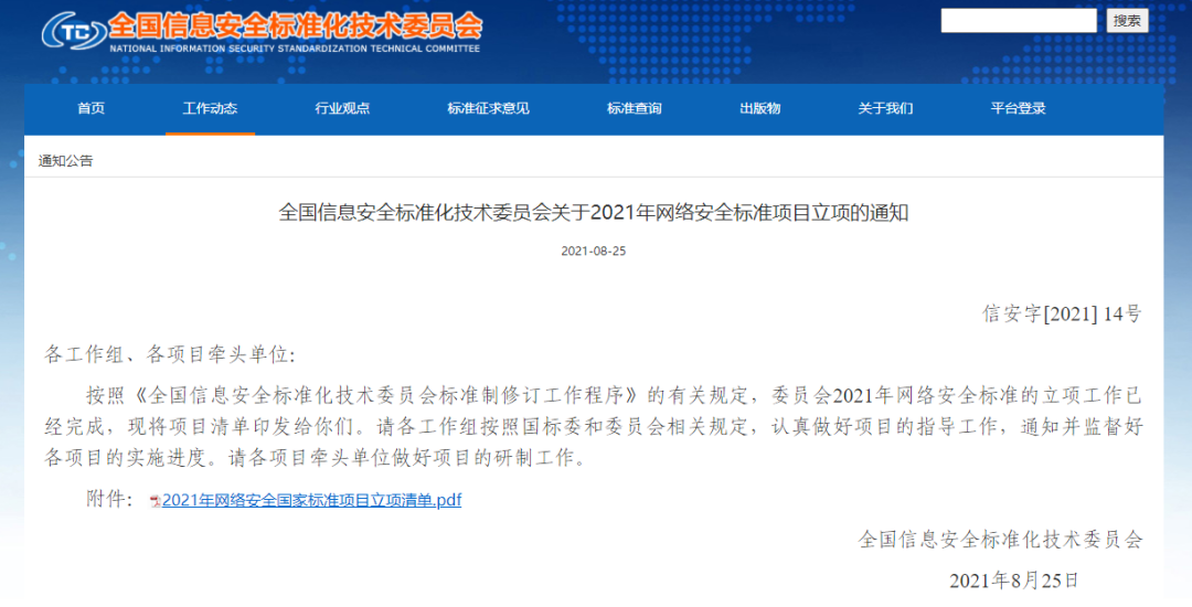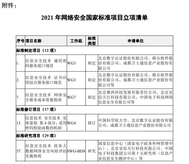 8月25日,全国信息安全标准化技术委员会(以下简称“信安标委”)发布《关于2021年网络安全标准项目立项的通知》(信安字[2021]14号),北京美高梅官网正网股份有限公司(简称:美高梅官网正网)牵头申报的《信息安全技术 证书应用综合服务接口规范》和《信息安全技术 通用密码服务接口规范》2项国家标准正式立项。