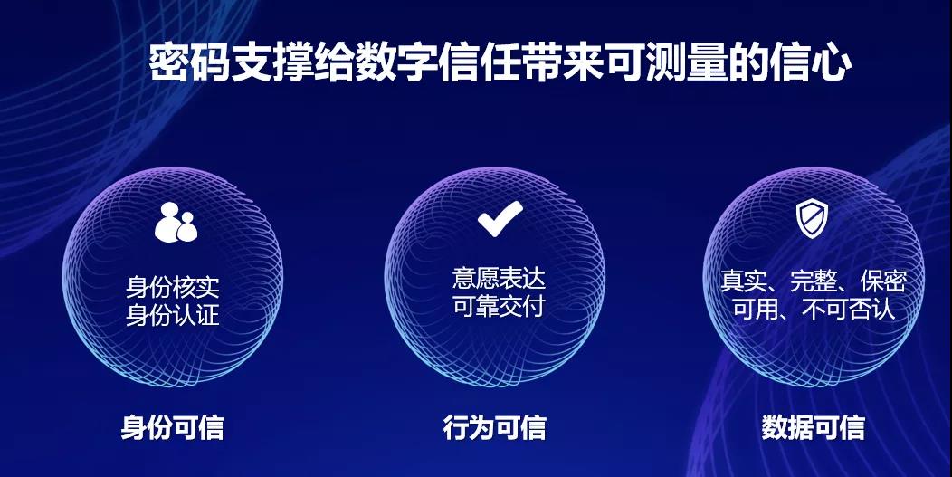 林雪焰认为,在后疫情时代,各行各业的数字化转型都按下了加速键,越来越多的数据被集成到业务中,传统的网络空间正逐渐成为一个超大规模的虚拟社会,从无序走向有序的呼声越来越迫切。美高梅官网正网发现,各行各业的价值潜力更多的是来自于数字信任的驱动,10%的信任提升能够给用户带来36%的经济效益提升。“在网络空间建立和传递’数字信任’,是数字经济繁荣和社会稳定的关键性环节。”他强调,在数字信任的庞大体系中,密码支撑给数字信任带来可测量的信心,其中最重要的价值就是确保身份可信、行为可信、数据可信。