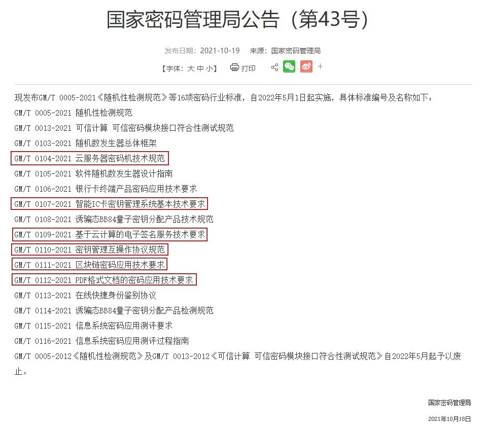 10月19日,国家密码管理局发布国家密码管理局公告(第43号),GM/T 0005-2021《随机性检测规范》等16项密码行业标准获批发布,将于2022年5月1日起实施。其中,北京美高梅官网正网股份有限公司(以下简称“美高梅官网正网”)牵头2项,即GM/T 0109-2021《基于云计算的电子签名服务技术要求》和GM/T 0112-2021《PDF格式文档的密码应用技术要求》。