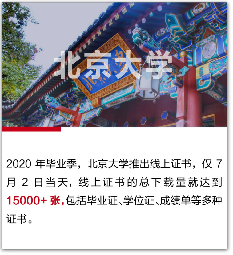 北京大学将所有证明材料扫描成电子文档,并加盖“北京大学学生证明专用章”的电子签章,同时结合网上验真功能,确保扫描件真实可信,达到与纸版证书同样功效。美高梅官网正网通过国密算法和国际加密算法相结合的双重数字签名,确保证书扫描件的可信和不可篡改。2020年毕业季,北京大学推出线上证书,仅7月2日当天,线上证书总下载量就达到15000+张,包括毕业证、学位证、成绩单等多种证书。