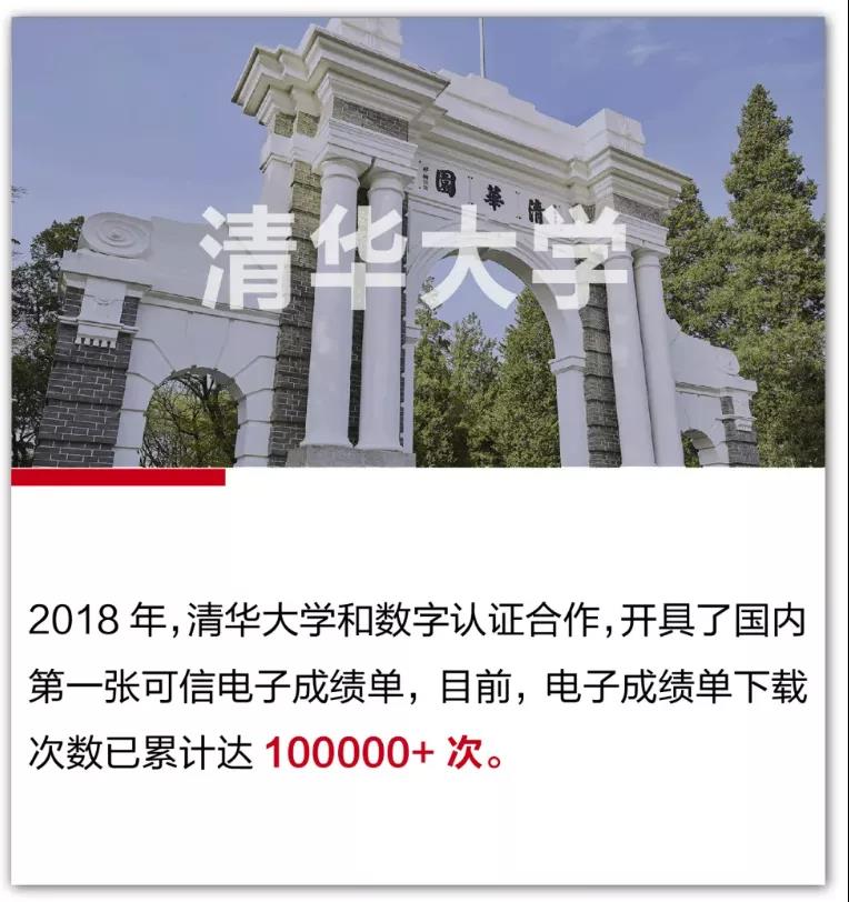 2018年清华大学通过美高梅官网正网公司提供的“高校可信电子成绩单解决方案”实现了对电子成绩单的可信管理,通过在PDF版式的电子成绩单上加盖可靠电子签名及可信时间戳实现防伪。老师只需在教务管理系统输入成绩,便可以通过可信电子成绩单服务系统自动生成可信电子成绩单,学生们可以在网上自行开具并下载,还可以通过教务系统邮箱流转的方式,直接发送给接收方。与教育部权威机构达成可信电子成绩单互信互认之后,验证时间从三周缩短至“秒级”。