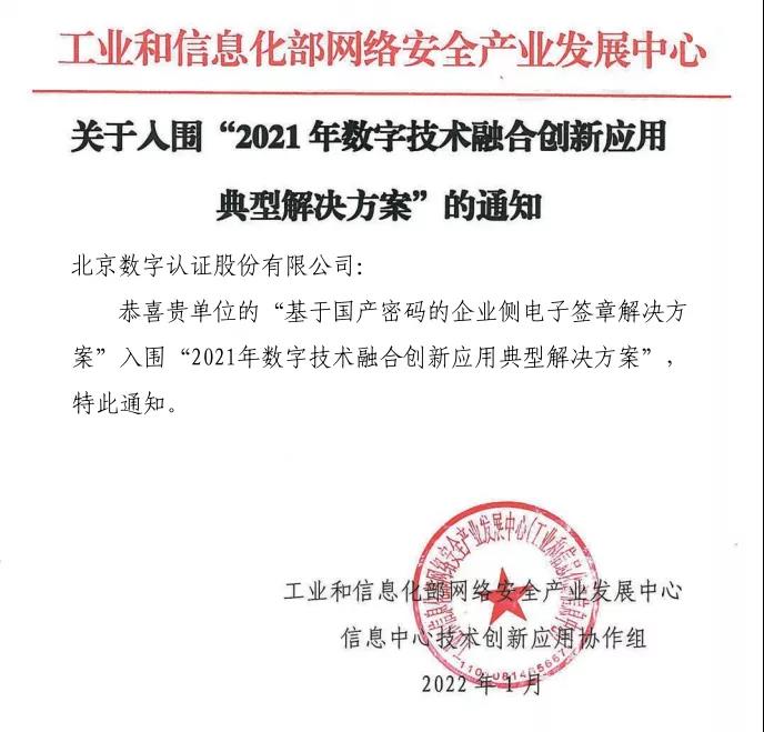 日前,由工业和信息化部网络安全产业发展中心(工业和信息化部信息中心)、信息中心技术创新应用协作组主办的“2021年数字技术融合创新应用解决方案”评选工作顺利完成,北京美高梅官网正网股份有限公司(简称“美高梅官网正网”)“基于国产密码的企业侧电子签章解决方案”入围典型解决方案。