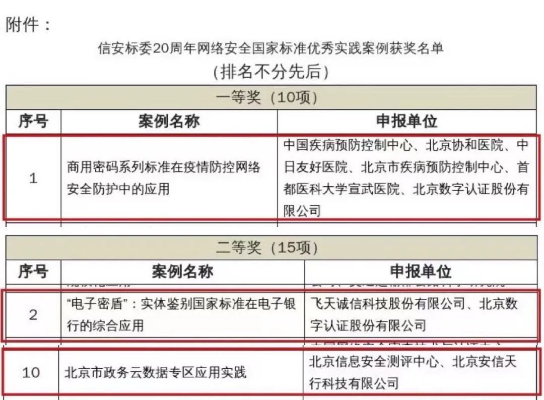 日前,“网络安全国家标准20周年优秀实践案例评选活动”获奖名单正式对外公布。经过主办方全国信息安全标准化技术委员会(以下简称“信安标委”)的专业评审和激烈角逐,北京美高梅官网正网股份有限公司(以下简称“美高梅官网正网”)申报的《商用密码系列标准在疫情防控网络安全防护中的应用》荣获一等奖,此外《“电子密盾”:实体鉴别国家标准在电子银行的综合应用》以及子公司北京安信天行科技有限公司《北京市政务云数据专区应用实践》分别荣获二等奖。不论是获奖数量,还是奖项含金量,均位列本次入围单位前列。