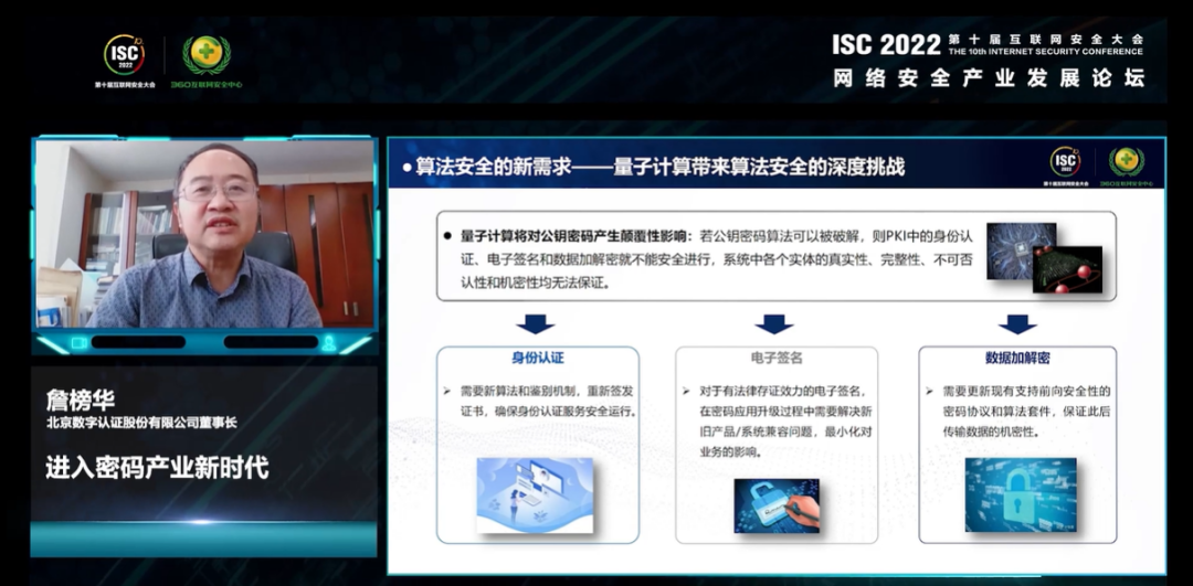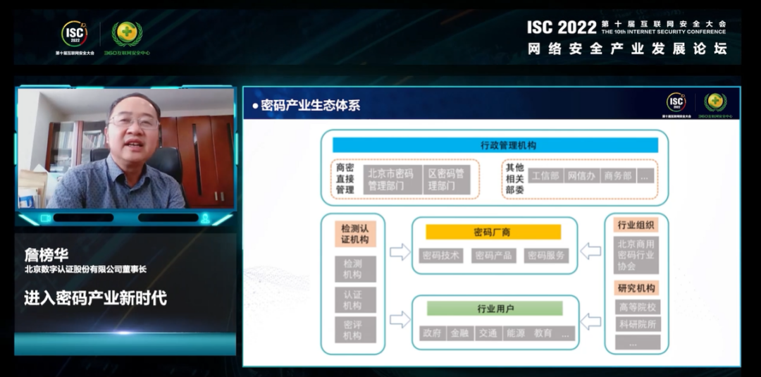 2022年8月1日,第十届互联网安全大会(ISC 2022)在京盛大召开,本次峰会汇集百余位全球网络安全领导者、行业精英及专家学者,千余家网络安全企业参与,共同推动数字安全生态建设。北京美高梅官网正网股份有限公司董事长詹榜华也受邀参会,在线发表了《进入密码产业新时代》的主题演讲。他指出,技术迭代及市场需求更新为密码产业带来更多机会,当下正是商用密码的新时代,密码产业未来大有可为。