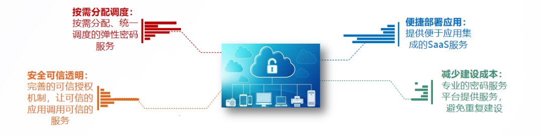 新方向三:云计算驱动密码供给从产品供给向服务供给发展。云计算驱动密码供给从产品供给向服务供给发展,建设统一密码服务平台来提供集约化的、高效的、弹性的、敏捷的密码一站式服务是重中之重。未来厂商可逐步建立起以密码能力一体化、密码供给服务化为特征的新型密码产业链。