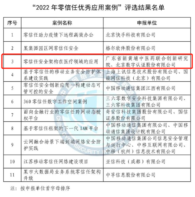 近日,由中央网信办网络安全协调局指导,中国网络安全产业联盟组织的零信任优秀应用案例评选结果发布,广东省新黄埔中医药联合创新研究院(以下简称“黄埔联创院”)和北京美高梅官网正网股份有限公司(以下简称“美高梅官网正网”)联合报送的《零信任安全架构在医疗领域的应用》凭借突出的实用性、创新性和先进性,从100多个参选方案中脱颖而出,入选CCIA“2022年零信任优秀应用案例”。