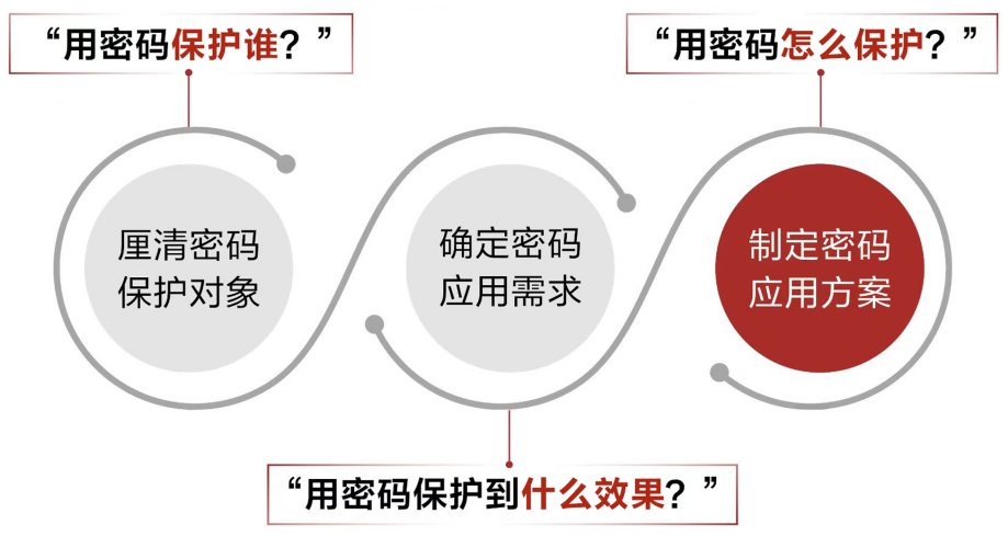 从环境、网络、设备、数据四个层面,划定密码应用的系统范围边界;梳理系统业务流程,识别和确认保护对象;对业务数据分类分级,澄清在给定业务中要保护的“重要数据”所在。