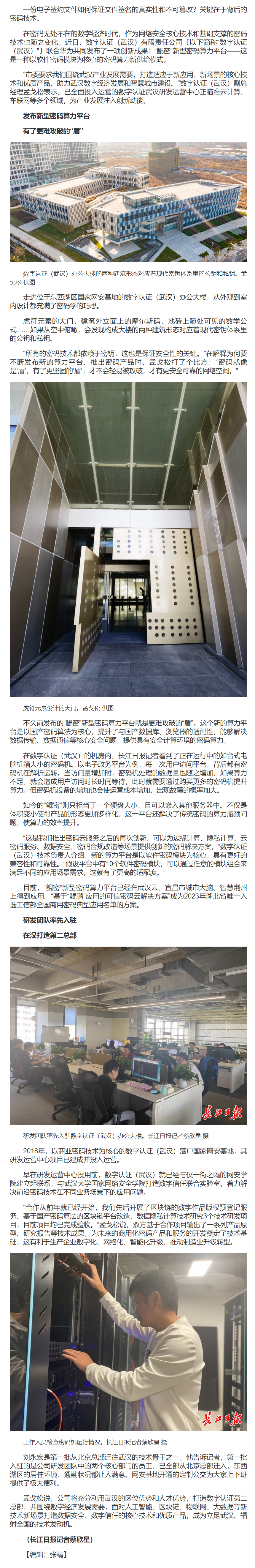 【转载长江日报】“鲲密”密码技术筑起更坚固的“盾”,美高梅官网正网在汉打造第二总部