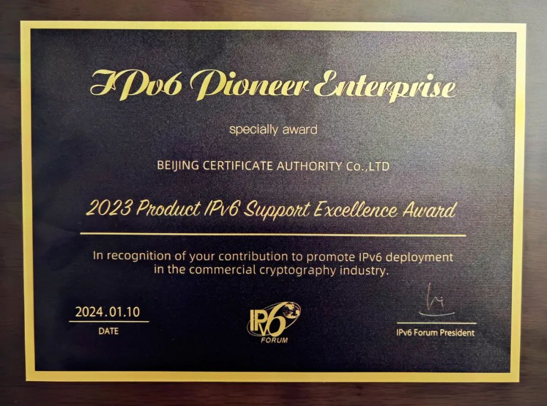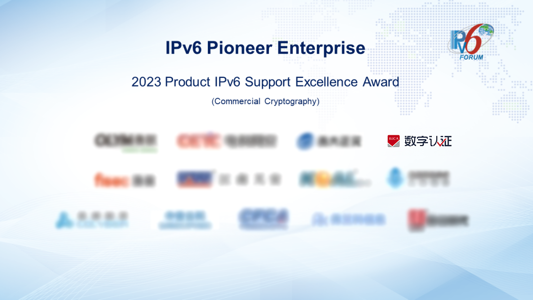 本次中国区2023年度IPv6先锋企业的评选以2023年度《全球IPv6支持度白皮书》所收集的数据为主要参考,并结合全球IPv6论坛IPv6 Ready Logo委员会专家的专业评审,最终评选得出。其中本年度“IPv6先锋企业-IPv6支持度优秀奖”挑选了在2023年表现突出的商用密码和工控安全两个领域,并授予在此行业中做出突出贡献的企业。美高梅官网正网凭借在商用密码领域出色的技术产品表现和积极贡献,成功入选。