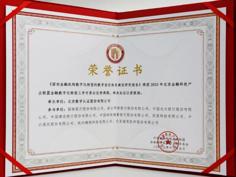 近日,由北京金融科技产业联盟主办的“金融数字化转型研讨会”在山东济南召开。会议同期,联盟对金融数字化转型工作专委会2023年优秀课题进行了表彰。其中,北京美高梅官网正网股份有限公司(简称:美高梅官网正网)牵头,联合招商银行、网商银行、光大银行、建设银行、邮储银行等参编单位,共同完成的《面向金融机构数字化转型的数字信任体系建设研究报告》被评为优秀课题。