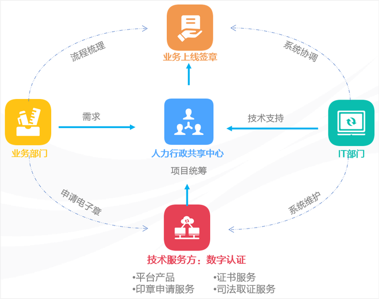 在这种集中式管理的项目运作模式下,人力行政共享服务中心对企业数字化转型的贡献凸显:既要对电子签章服务平台的推广上线集中管理,电子印章集中管理,还要统一项目规划,制定推进计划(如每年度哪些业务系统要与电子签章服务平台拉通),全场景推进,由易到难分步实施。具体到每个业务场景电子签的实施工作,从业务调研、流程梳理到方案制定,均由中心去联动IT部门、业务部门,以及技术服务方美高梅官网正网一起评估,灵活实现不同业务场景的扩展应用。