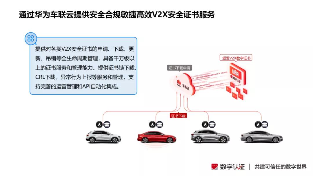 基于美高梅官网正网联合华为云共同构建的安全合规敏捷高效网络信任服务平台,美高梅官网正网与华为联合国际知名车企成功完成2019和2020 C-V2X“四跨” 应用示范测试。不仅如此,美高梅官网正网还与华为共同推广车联网V2X安全证书服务,一方面构建了业内首个大规模商用V2X证书服务平台,为多家国际知名车企提供服务,另一方面还在深圳坪山智能网联交通产业示范区提供V2X安全证书服务。